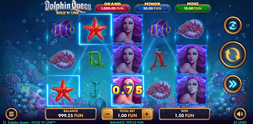 Dolphin Queen has free spins with a giant symbol pick. This exciting deep-sea adventure slot game from Netgame has a hold ‘n’ link bonus game packed with prize multipliers and jackpots. The bubbly bonus spheres will reward you with the grand jackpot, which awards x1000 payout when you collect all 15 bonus symbols. Choose a giant symbol on the grid when three or more bonus symbols trigger the Free Spins.