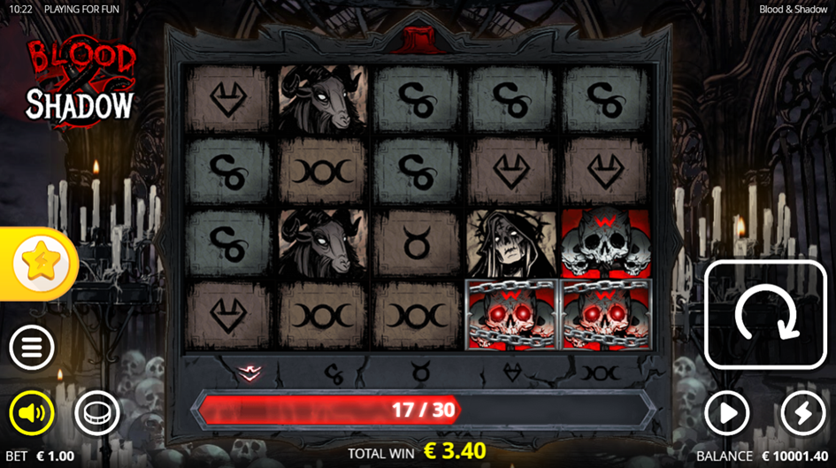 - Play Mode - Blood & Shadow is a 4-4-4-4-4 reel video slot game with 1024 paylines, a unique Reel Area, a Ritual Bar, Candle and Cursed Spins, Sticky Wild, xSplit, Baphomet Rite and NoLimit Bonus Buy features.