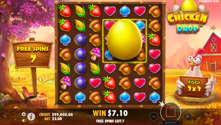 - Play Mode - Chicken Drop is a 7x7 reel video slot game with Shamrock and Watering Can Multipliers, Tumble Feature, Progressive Feature, Free Spins, a Buy Feature, and a Maximum Multiplier of x5,000.