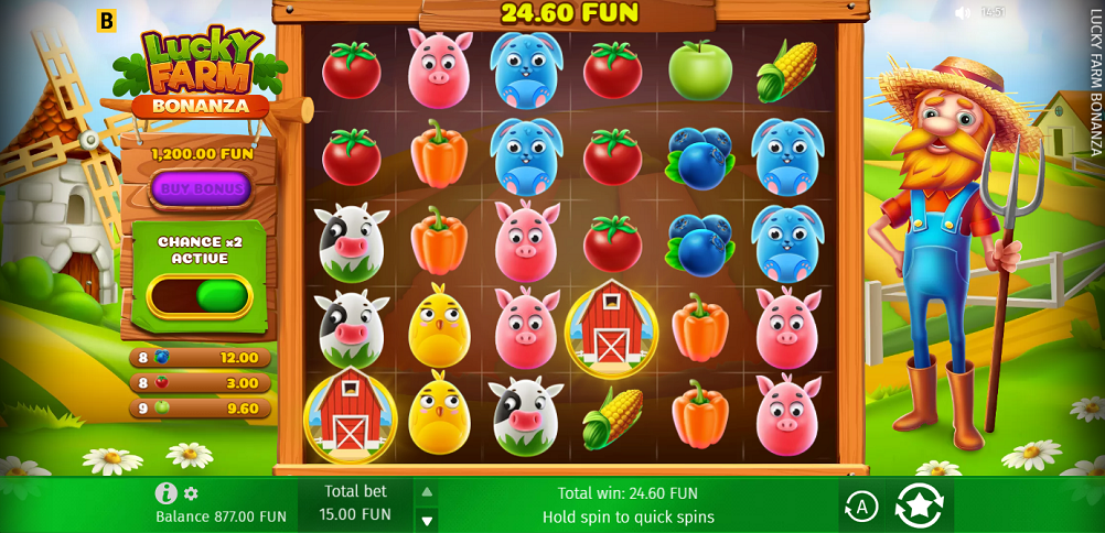 • 96% RTP (Return to Player) - Lucky Farm Bonanza has a 96%RTP with a 2.60 hit rate, a maximum multiplier of up to x15 000 and a maximum win of 180 000 EUR.