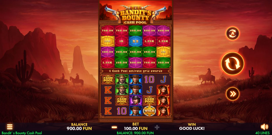 - Play Mode – Bandit’s Bounty: Cash Pool is a 5x4 reel video slot game with 40 paylines and has Bonus, Cash Pool, and Wild Cash Pool symbols with a Cash Pool Feature and Cash Pool Multiplier.