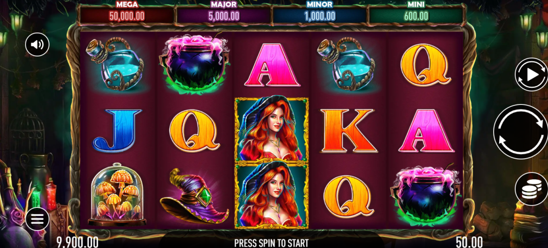 - Wild symbol – The Witch is the Wild Symbol, which substitutes for all symbols except the Scatter symbol and appears on reels 2,3,4 and 5.