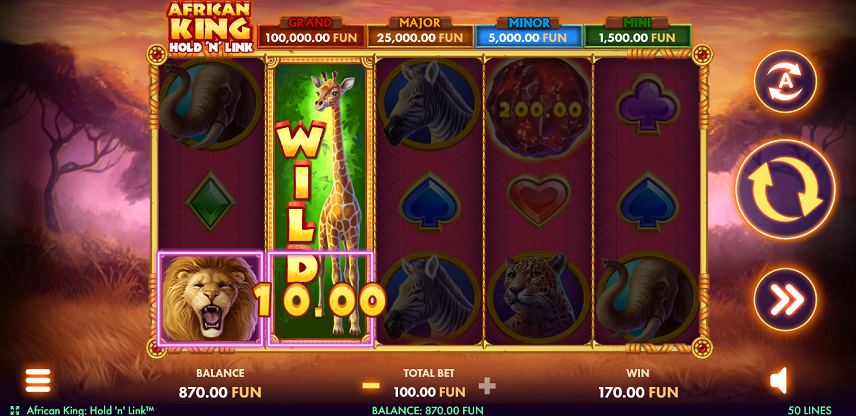 • Play Mode – African King: Hold 'n' Link is a 5-reel 3x5 video slot game with 50 paylines.