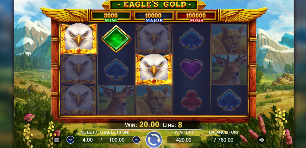 There is a lot of Gold to hunt for in Eagle's Gold Hold 'n' Win, so let us get started immediately on this flying mission.