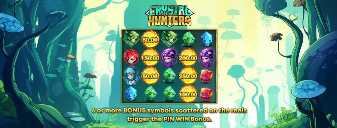 • Play Mode - Crystal Hunters is a 4x5 reel video slot game with 50 paylines, a Maximum Multiplier of x1000, Expanding Wilds symbols, and a Pin Win Bonus.