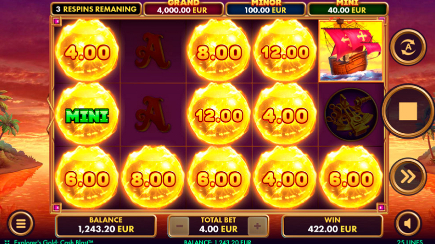 • Play Mode – Explorer’s Gold: Cash Blast is a 5 reel, 5x3 video slot game with 25 paylines and a x294 maximum win base game with Scatters, Wilds and Free Spins.