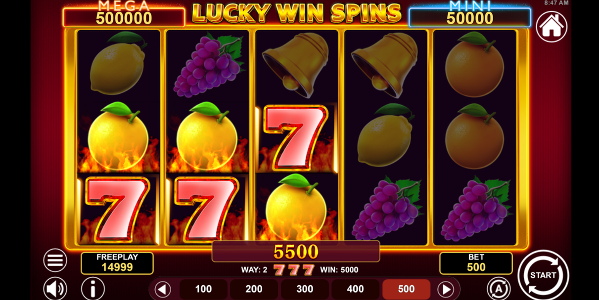 - Play Mode – Lucky Win Spins is a 5x3 reel video slot game with 243 paylines with Bonus Symbol, Bonus Round, Mini Jackpot, and Mega Jackpot.