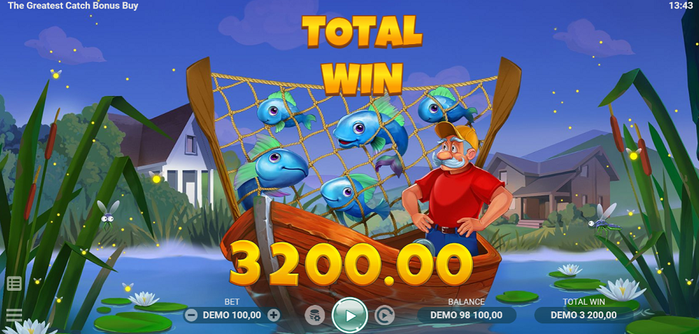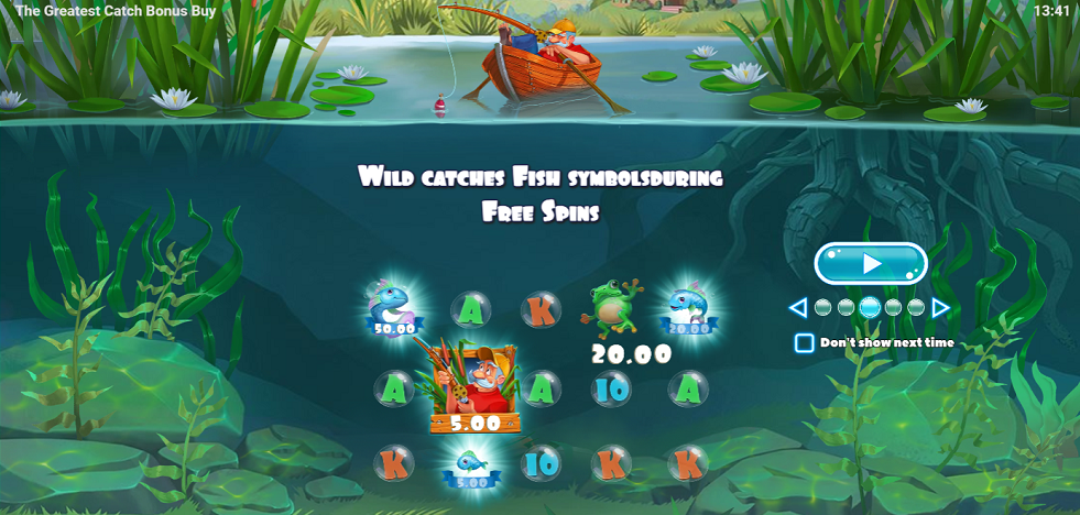 I am bobbing along in my fishing boat, taking in the fresh air and the sun, when BOOM! There is dynamite exploding and Free Spins lashing out of the quiet lake, awakening my winning streak. I want to brag about catching the biggest Fish, and The Greatest Catch Bonus Buy gives me a chance to do just that.