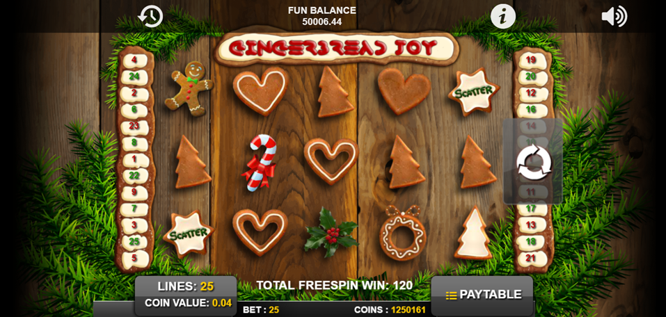 • Minimum and maximum bet - Gingerbread Joy has a minimum bet of 0.01 and a maximum bet of 62.50.