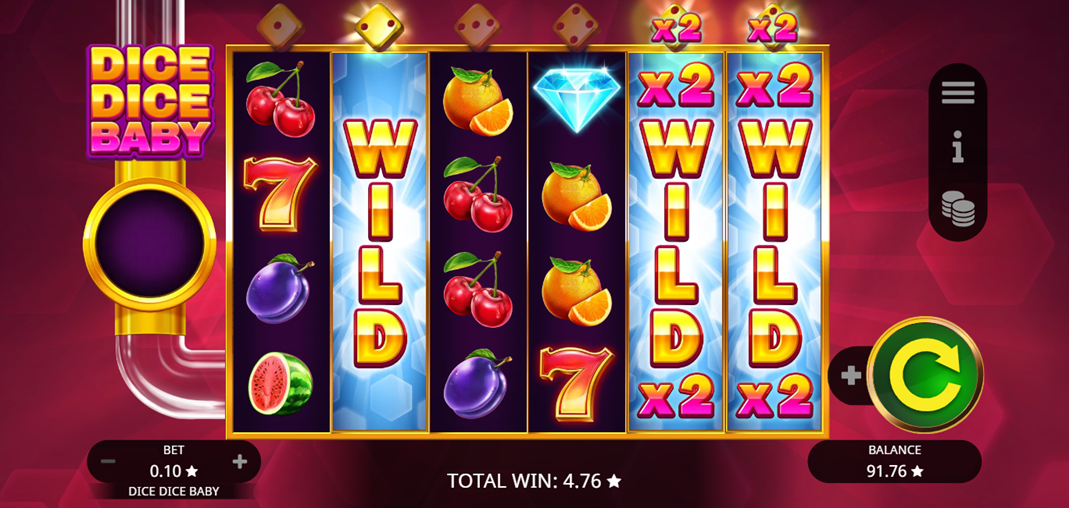 Purr! Dice Dice Baby by Booming Games has a fun combination of traditional fruit slot mechanics combined with dice multipliers. I love the way the dice shoot through the funnel and land on the screen, giving multipliers within the bonus game. Dice Dice Baby makes me want to dance around, and you will, too! Purr!