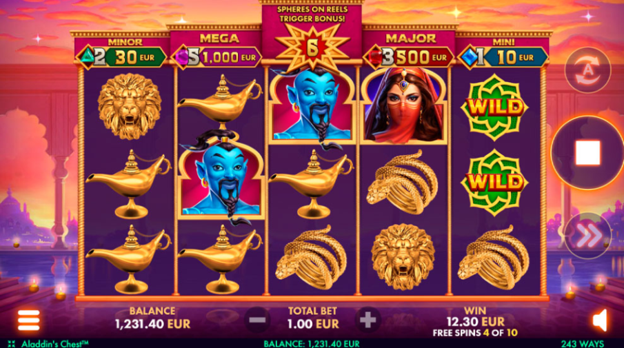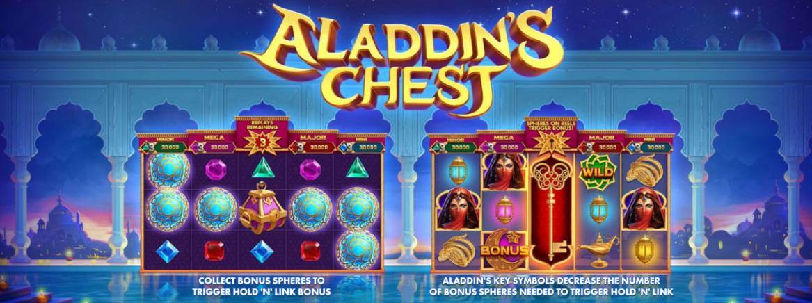 • Play Mode – Aladdin's Chest is a 5x3 reel video slot game with 243 paylines and has Bonus, Key +1 Spheres and Multiplier Symbols with Hold' n' Link and Jackpots