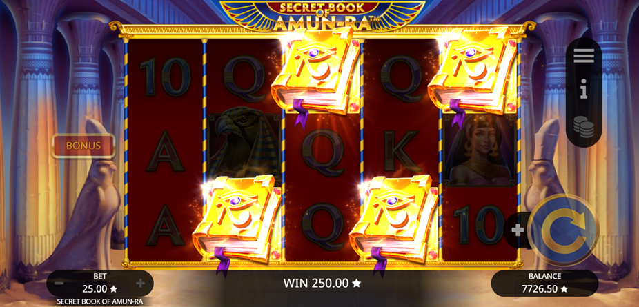 - Play Mode – Secret Book of Amun Ra is a 4x3 reel video slot game with Elimination symbols, a Maximum Multiplier of x10 000, a Wild Scatter symbol, an Expanding Symbol, Buy Bonus, and Free Spins.