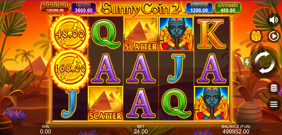 • Egyptian graphics – Sunny Coin 2: Hold the Spin sports an Egyptian theme with Sphinx, Cats, Pyramids, Golden Horses, and mystical music to ching your way to wins.