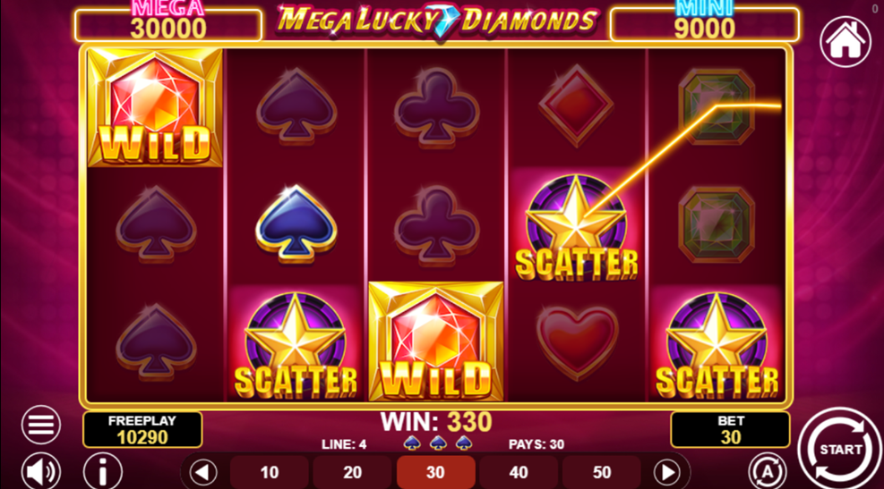 • Play Mode - Mega Lucky Diamonds is a 5x3 reel video slot game with 10 paylines, Wild and Scatter Star symbols, and a Lucky Jackpot Feature.