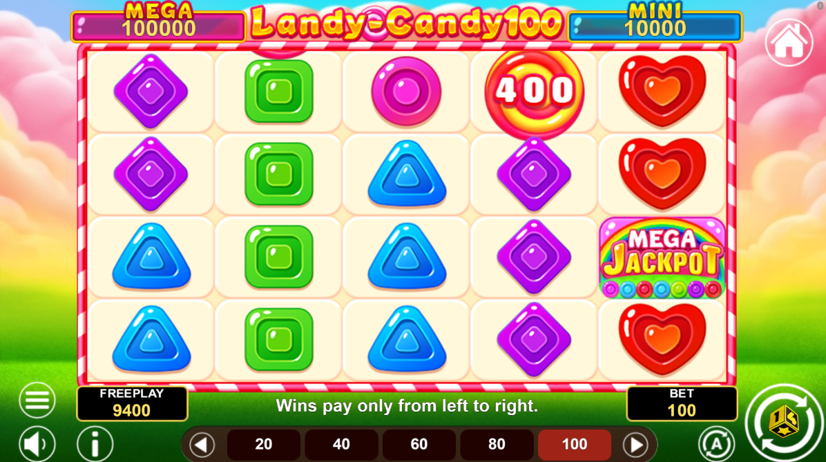 - Play Mode - Landy Candy 100 is a 5x4 reel video slot game with a total of 100 paylines and has a Wild and Coin Symbol, with Mega and Mini Jackpot features.