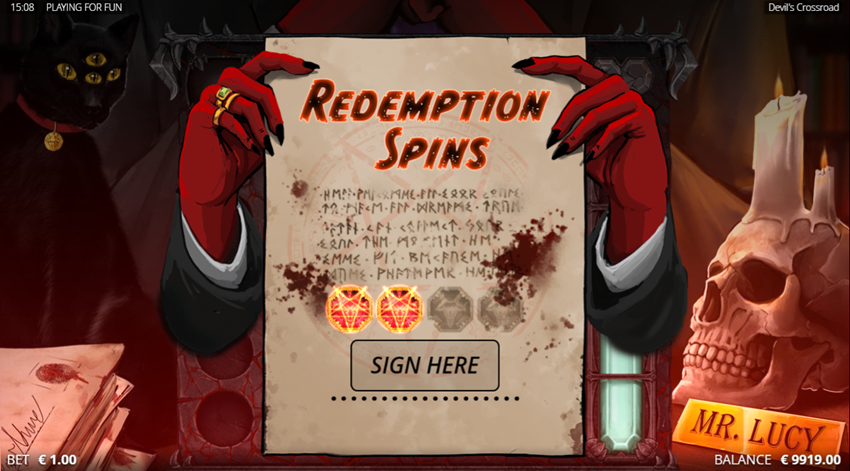 Reel Area: The Devil’s Crossroads reel area is divided into 4 sections connected by a devil wild in the centre. Winning combinations are removed, and the remaining symbols fall into the centre. New symbols fill the empty spaces.
