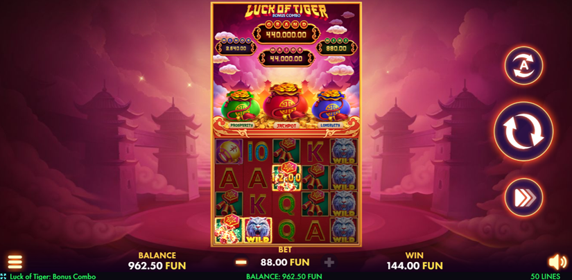 Luck of Tiger : Bonus Combo is a joyous adventure that will lead you on a path to free spins bonus games and winning bonus combo coins. Prosperity, longevity, and jackpots will multiply your wins in an uplifting symphony of animations and bonus features that provide wins up to x7000 of your bet.