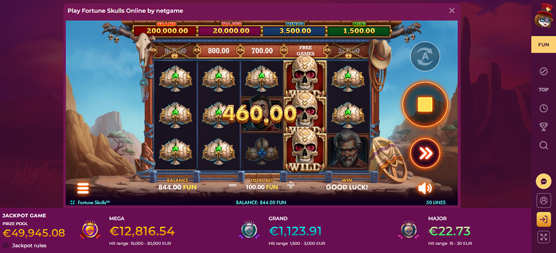 • Minimum and maximum bet - The minimum bet on Fortune Skull is 0.50, so you can play comfortably, or if you want to go a bit hotter, you can bet a maximum of 100.00.