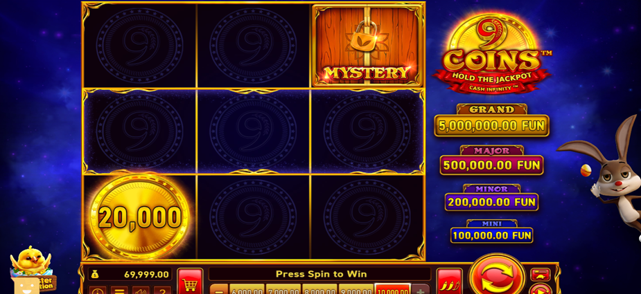 - Play Mode – 9 Coins™ Easter Edition is a 3x3 reel video slot game with a Unique Gamble Feature, Hold The Jackpot, Sticky To Infinity, Volatility Levels™, Buy Feature, and Hold The Jackpot Bonus Game.