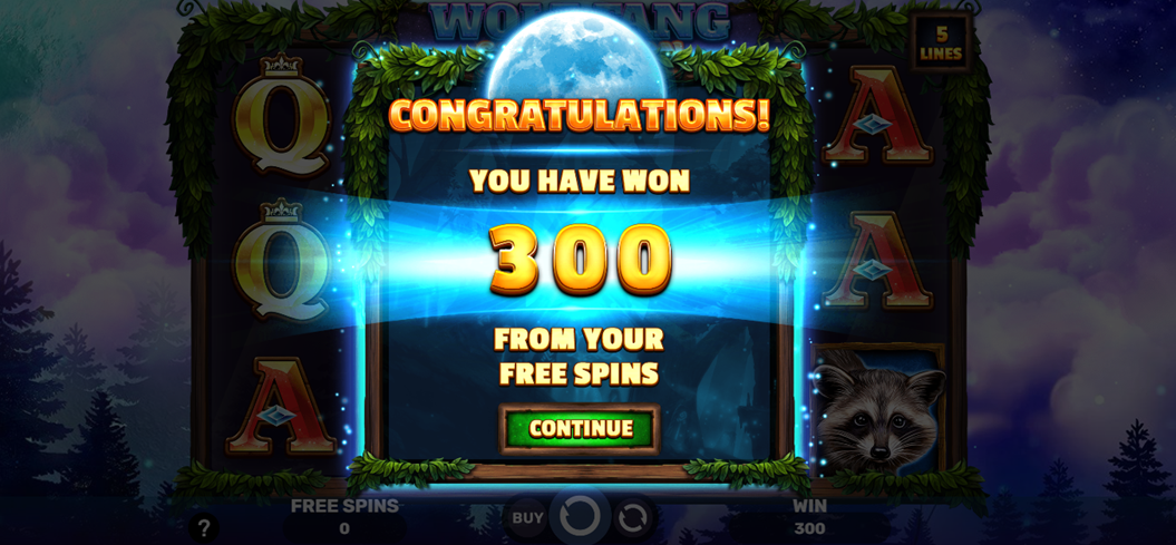 Gruff! It is fantastic to use the Buy feature to get even more Free Spins while chasing owls, foxes, racoons, cougars, and the wolf, Wolf Fang. I watch the clouds drift and the stars move as the Free Spins whizz around, giving me some spectacular wins. The Supermoon Free Spins have random multipliers of up to x3 when I use the Choose Your Play feature. What a bonus!