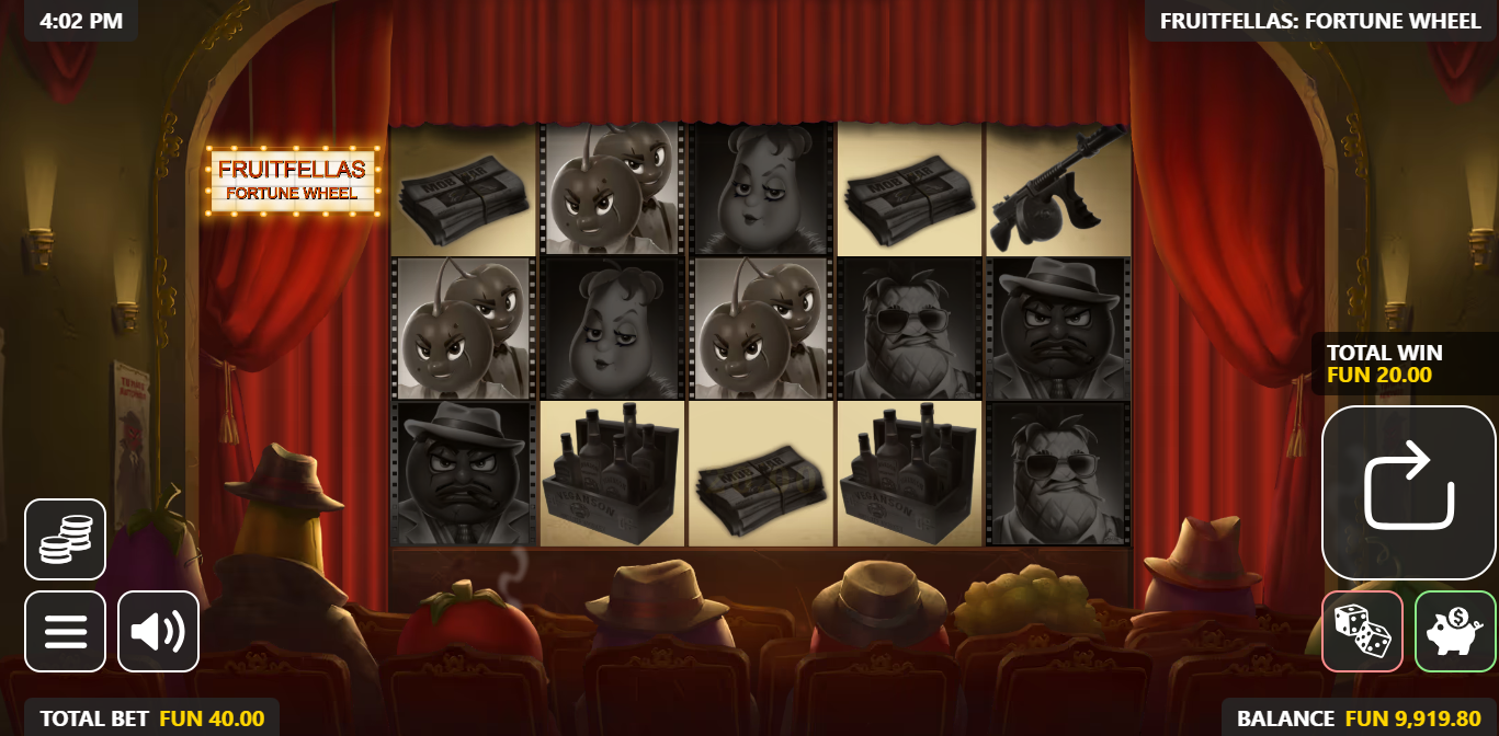 - Old-Style Cinema graphics – Old-style cinema graphics immerse the player in Fruitfellas Fortune Wheel with fruity gangstas, jazzy music and booze, guns and washing machines full of cash.