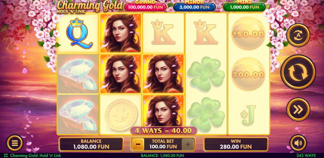 • Play Mode – Charming Gold: Hold 'n' Link is a 5x3 reel video slot game with 243 paylines with Burst, Wild and Golden Sphere symbols and a Burst and Hol ‘n Link feature.