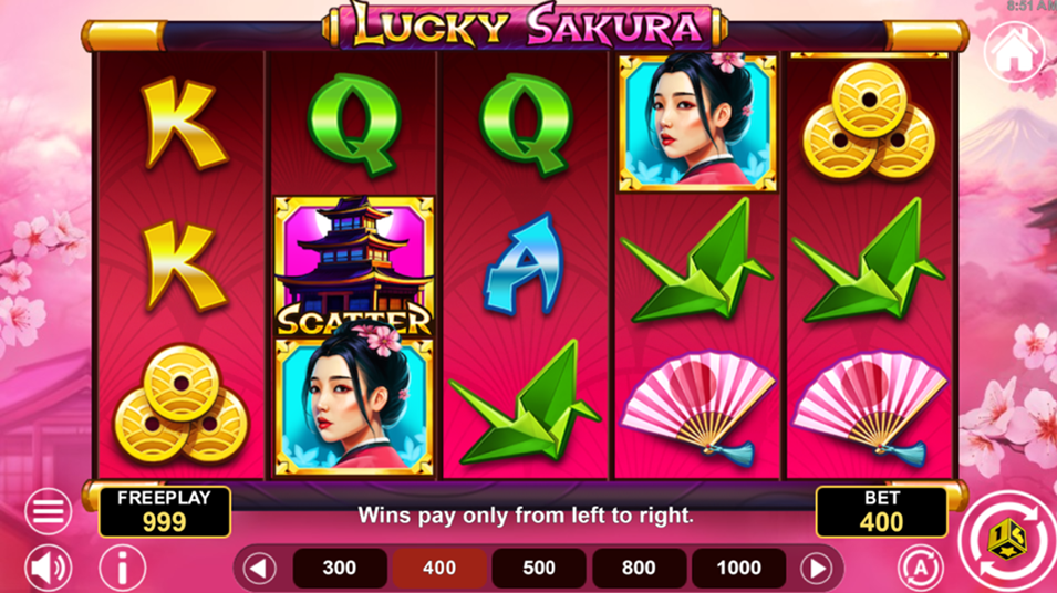 • Japanese graphics – Lucky Sakura will amaze you with its beautiful graphics, along with the jingly sound effects while the symbols waft on the screen.