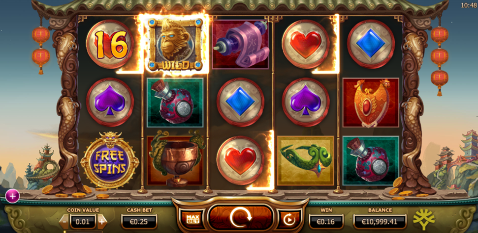 Playing Legend of the Golden Monkey with its Sticky Wild Monkeys that are Incremental and then Stacked, giving multiplier rewards and Free Spins. Gruff!