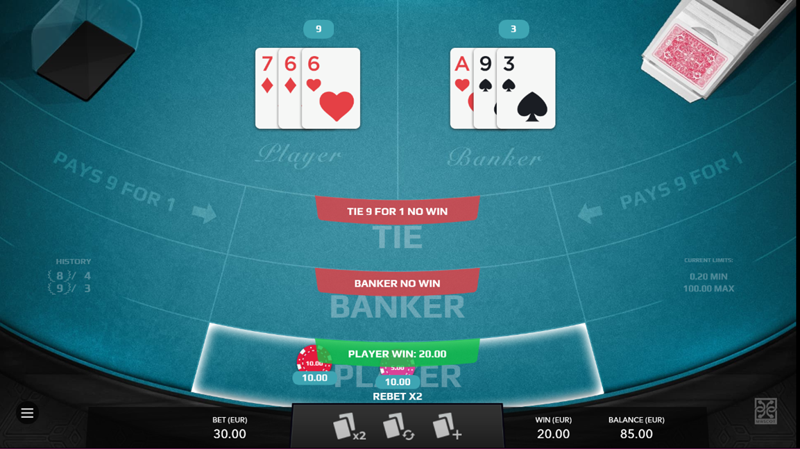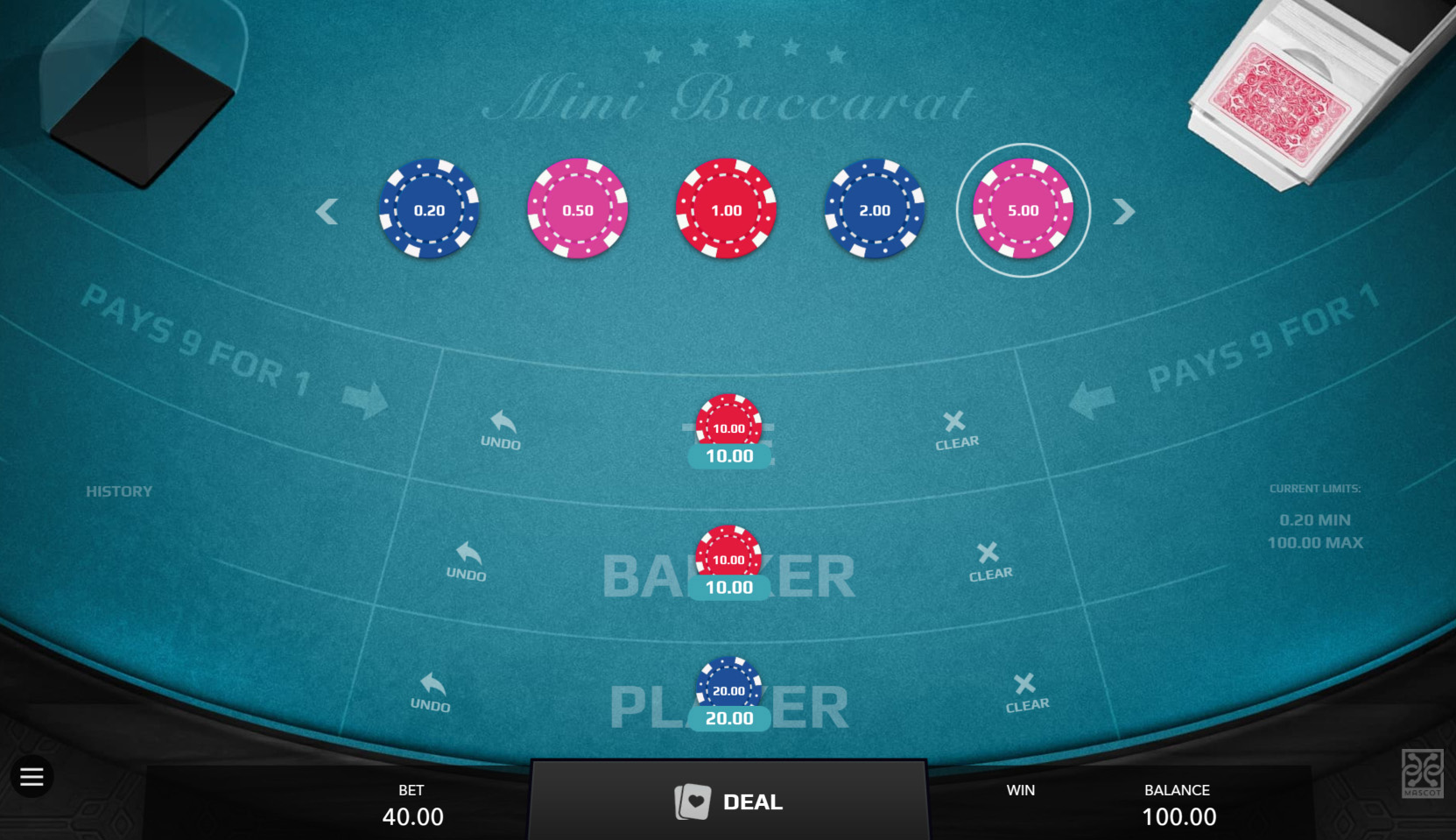 • Minimum and maximum bet - Baccarat has a minimum bet of 0.20 and 50.00 as a maximum bet.