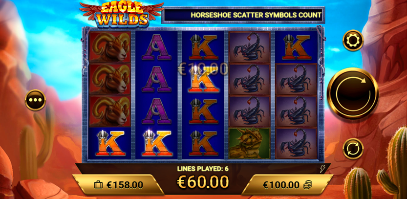 Eagle Wilds allows you to soar on the eagle wild wings while the windy sound effects blow scorpions, snakes, mountain goats, and wild eagles in your direction with gusts of good wins.